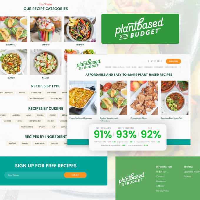 Plant-Based On A Budget is designed to not only look great but also load fast. The site’s success is thanks in part to a speedy load time that met Google PageSpeed Insights Test and Core Web metrics requirements for an optimized website experience on the web. Speed is critical considering the high-quality images the site hosts for hundreds of recipes across the site.